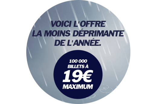 On a décidé de prendre les choses en main pour rebooster votre moral. Voyager, c’est le meilleur remède contre la grisaille, et c’est encore mieux à prix tout doux. Notre mission aujourd'hui ? Transformer ce lundi déprimant en un lundi motivant grâce à une pluie de voyages. Résultat : 100 000 billets à 19 € maximum. Simple et efficace !