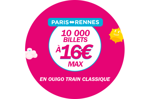 Que vous ayez envie de l'ambiance chaleureuse de Rennes ou de la frénésie de la capitale, c'est le moment de sauter dans le train. OUIGO met en vente 10 000 billets au prix imbattable de 16€ maximum sur la ligne Paris - Rennes !
