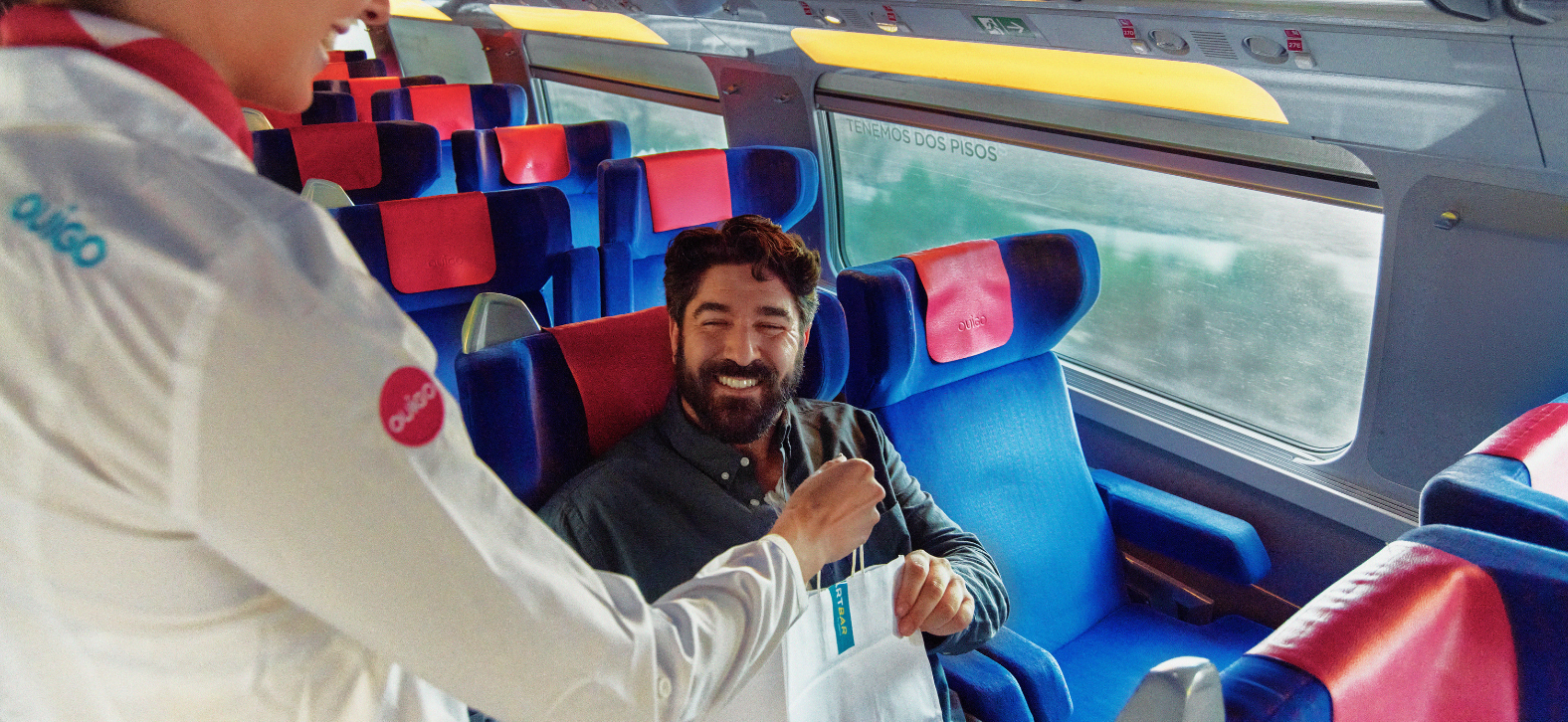 Con SMARTBAR de OUIGO, pide comida y bebida desde tu asiento y ahorra tiempo.